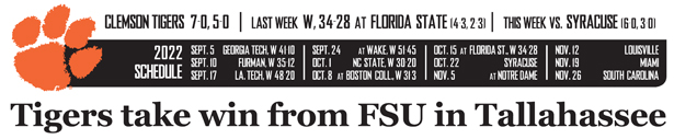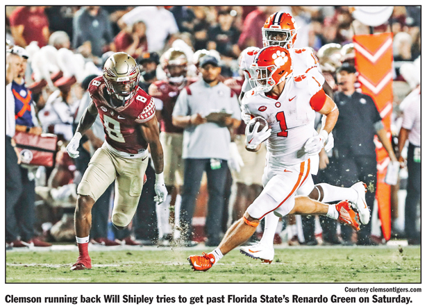 TALLAHASSEE, Fla. — No. 5 Clemson scored 17 points in a two-minute span on either side of halftime to take command of the game in a 34-28 win at Florida State on Saturday night.