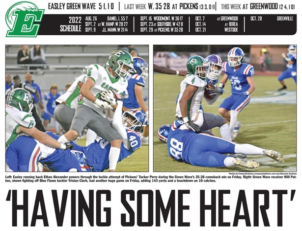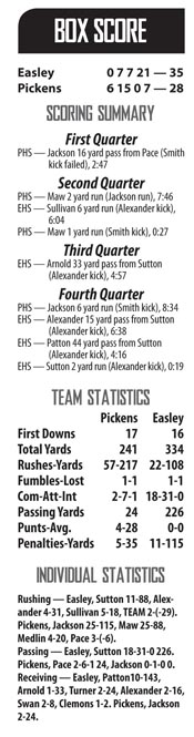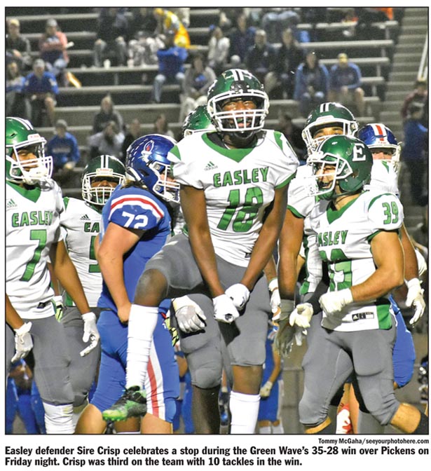 The big issue for Easley was it couldn’t get off the field defensively as Pickens ran 35 plays from scrimmage in the first half to only 16 for the Green Wave.