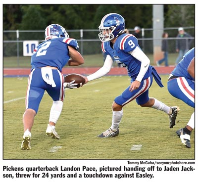 Pickens let a 14-point fourth-quarter lead get away Thursday night in falling to archrival Easley, 35-28.