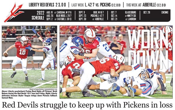 LIBERTY — Despite a week off to try to get healthy and prepare for a matchup against county rival Pickens, the Liberty Red Devils had no answers for the Blue Flame on either side of the ball in a 42-7 loss on Friday night.