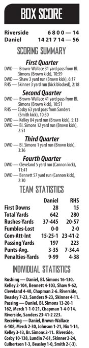 the Daniel offense, along with an impressive showing from senior Misun “Tink” Kelley, in a dominant 56-14 win.