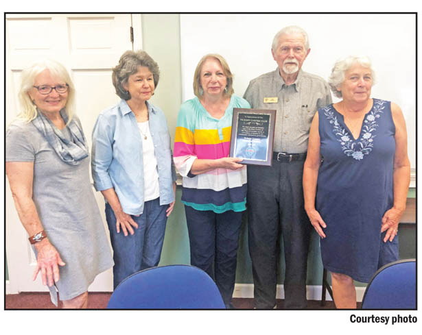 At the September monthly Board meeting of the Pickens County Historical Society, the Pickens Garden Club was presented with a plaque of appreciation for its decades of caring for the Rose Garden at the historic Hagood-Mauldin House and Irma Morris Museum of Fine Arts, a cultural centerpiece of the Pickens community. Pictured, from left, are Garden Club members Ann Bowen, Anne Hall, president Mary Hardin, Historical Society president Ken Nabors and Cindy Wood.