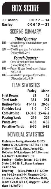 Trailing 14-6 with about three minutes to play, Easley faced fourth and 14 from the Mann 38. Quarterback Kalab Sutton hit receiver Will Patton at the 20. He