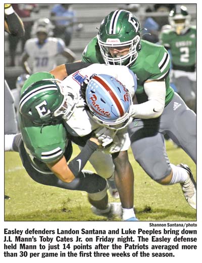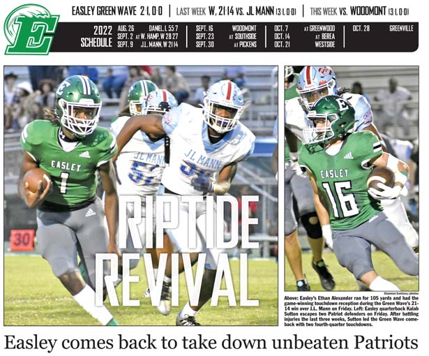 EASLEY — The Easley Green Wave rallied for two touchdowns in the waning moments of Friday night’s game to defeat unbeaten J.L. Mann, 21-14.