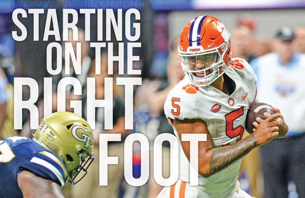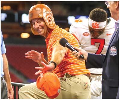 Clemson Tigers overcame a sluggish first half to open the 2022 season with a 41-10 win over the Yellow Jackets in the Chick-fil-A Kickoff Game on Monday night at Mercedes-Benz Stadium in Atlanta. At right, Clemson coach Dabo Swinney poses wearing the Old Leather Helmet trophy presented to the game’s winning team. To read more about the Tigers’ season-opening victory, click on sports tab or pick up a copy of Courier’s Football Frenzy section.