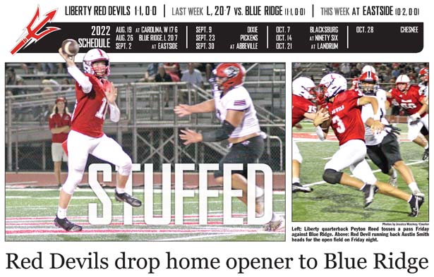 LIBERTY — Coming off of a win at Carolina to open the season, the Liberty Red Devils failed to keep the momentum as they dropped their first home game of the year in a 20-7 loss to Blue Ridge on Friday night.