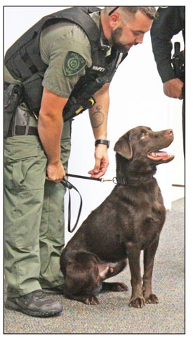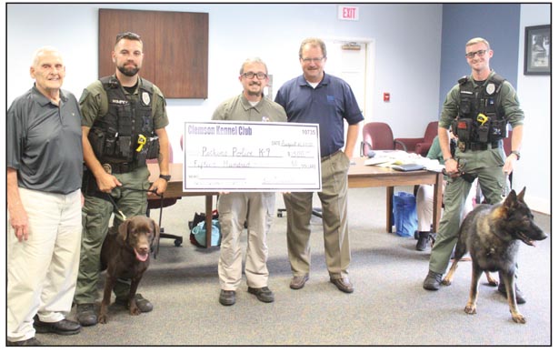 The Clemson Kennel Club made a $1,500 donation to the Pickens Police Department last week for additions to the department’s K-9 unit. In addition to the donation, in conjunction with the CKC, the department was able to qualify for a grant of up to $7,500 from the American Kennel Club. “We sincerely hope that individuals and merchants in the city along with the service clubs will be inspired to get behind this fundraising effort and contribute to this very worthwhile cause,” the Clemson Kennel Club said in a news release. “The K-9 unit will be an invaluable asset for the Pickens Police Department and add a much-needed level of policing for the entire city. The club presented a check to the police department on Aug. 10 at the Central-Clemson Branch Library. The department recently acquired a new K-9, Duke, pictured at left with his handler, officer Braden Wimpey, to join K-9 officer Boss, pictured above at right with his handler, Caleb Cassell. Photos by Jessica Mackey/Courier