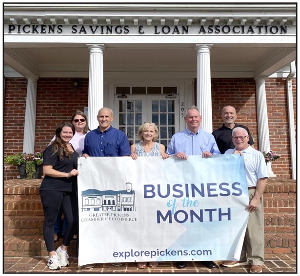On October 1, the Greater Pickens Chamber proudly recognized Pickens Savings and Loan as the October Business of the Month. A dedicated and valued Chamber member, this outstanding business has made meaningful contributions to the community and beyond. Pickens Savings and Loan has been trusted in the community since 1920. They are 105 years old, and the only bank headquartered in Pickens County. The main office is in Pickens at 205 E. Cedar Rock Street and a second location was opened in downtown Six Mile back in 2019. Join all in congratulating Pickens Savings and Loan on this well-deserved honor. Pictured are Samantha Scott (Chamber Board Member), Debbie Gravely (Chamber Board Member), Harold Alexander (Executive Vice President Senior Lender) , Susan Dunaway (Vice President Deposit Services), Rod Gettys (President and CEO), David Michel (Chamber Board Member), and Bryan Owens (Chamber Executive Director).