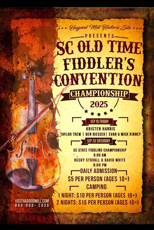 PICKENS — Old-time musicians from across the region will gather at the Hagood Mill Historic Site for the annual South Carolina Old Time Fiddler’s Convention, featuring the official SC State Fiddling Championship, on Friday and Saturday, September 19–20. This beloved, state-sanctioned two-day event draws competitors, music lovers, and
