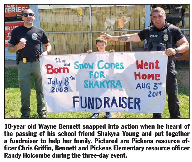 On Aug. 8-10, 10–year old Wayne Bennett, son of Dewayne and Renee Bennett, with help from family and friends, organized a snow cone fundraiser in honor of classmate Shakyra Young, who passed away on Aug. 3.