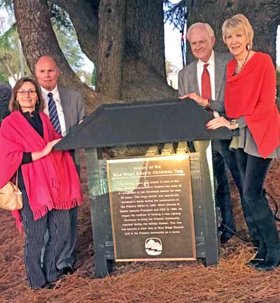 Pickens has been lit in recognition of the Christmas season for over 50 years,” the plaque reads. “This large conifer was spared the bulldozer’s blade during the construction of the Pickens Office in 1953. When Charles E. Dalton became President and CEO in 1982, he began the tradition of holding a tree lighting ceremony to bring the Pickens Community together during the holiday season. This tree has become a main stay at Blue Ridge Electric and in the Pickens community as a whole.” At right, current Blue Ridge president Jim Lovinggood and his wife, Denise, pose alongside the plaque with Dalton and his wife, Libby. Dalton, who retired in January, had the honors of lighting the tree this year. Photos by Karen Brewer/Courtesy The Christian View magazine