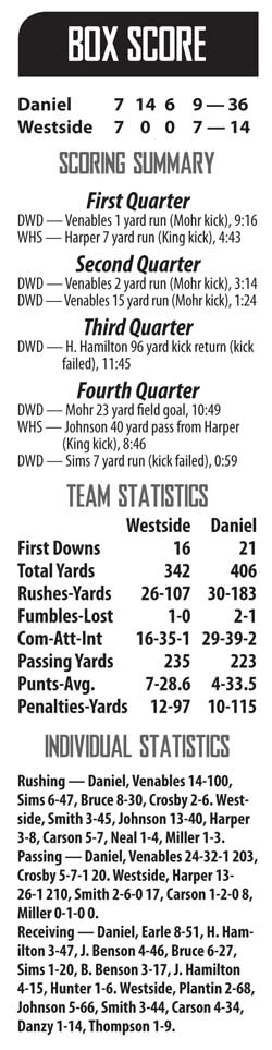 CENTRAL — The Daniel Lions continued their dominant ways Friday Night, beating the Westside Rams by a final score of 36-14 and getting off to the best