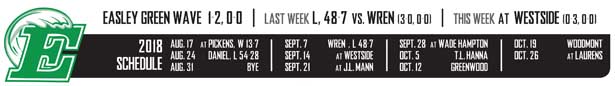 Quarterback Weston Black hit Ethan Boyles on a nice sliding catch for 20-yard on third and five on Easley’s first possession, but the drive stalled, and Malaki Aleman tried a 28-yard field goal. Former Green Wave Anthony Goodwin was credited with the block, and the Wren standout recovered the ball and returned it 23 yards to the 27.