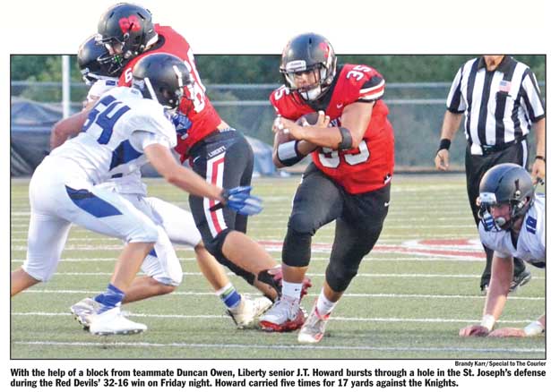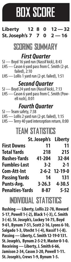 The Knights’ run game appeared to be a struggle for Liberty early on, but quick adjustments by the coaching staff kept St. Joseph’s at bay most of the game.
