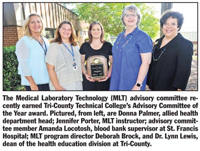 UPSTATE — The Medical Laboratory Technology (MLT) advisory committee’s devotion to student success and its attention to shaping the curriculum to meet workforce needs earned it Tri-County Technical College’s Advisory Committee of the Year award.