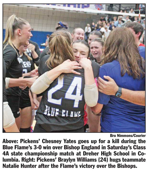 The Bishops, the national leader in volleyball state championships according to the South Carolina High School League, failed to provide much of a challenge for Pickens as the Blue Flame swept the Bishops 3-0 in straight sets to secure Pickens’ 18th volleyball state championship in school history.