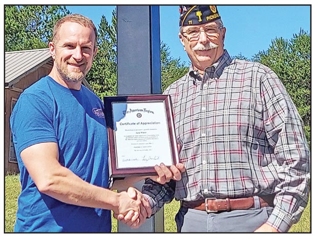 Jock White, owner of Jock White Collision Repair Shop, receives a letter of appreciation from Pickens American Legion Post 11 sergeant at arms Rick Noyce for his support of the Legion. White allows the Legion to utilize his parking lot to facilitate bi-yearly garage sales, which help to make it possible for the American Legion to send qualified Pickens High School students to Boys and Girls State each year.