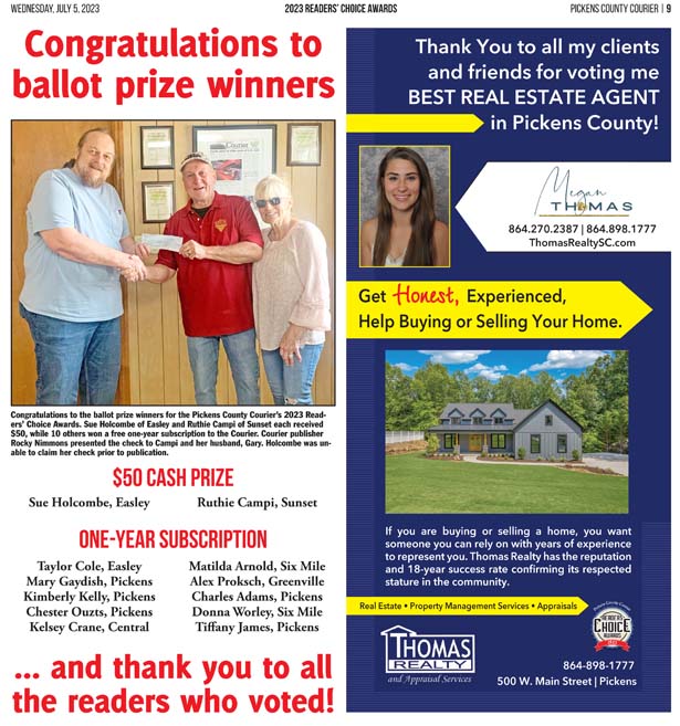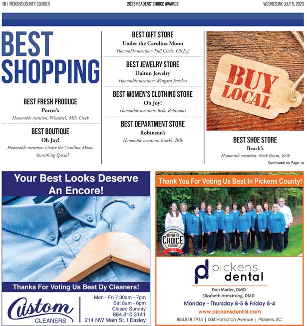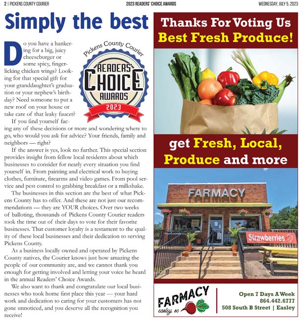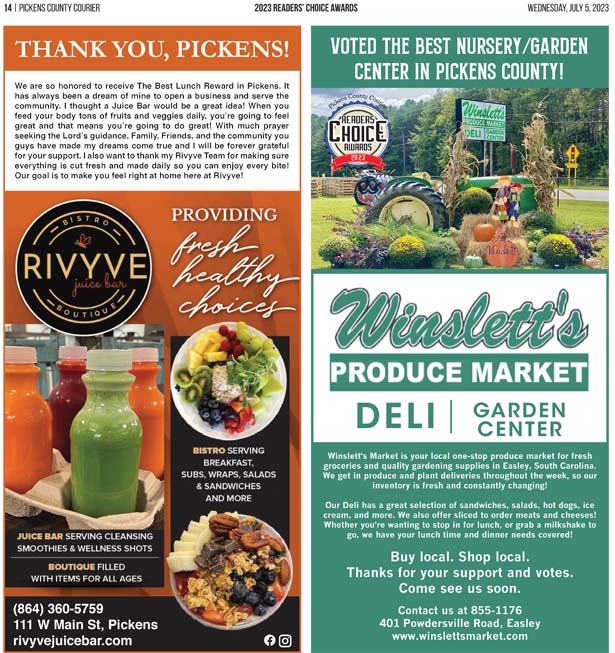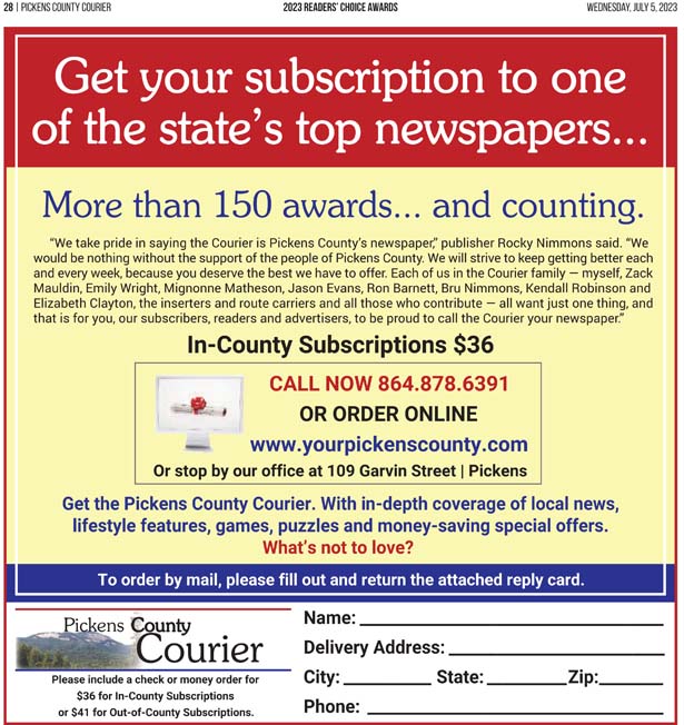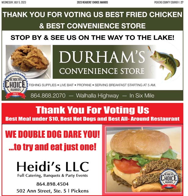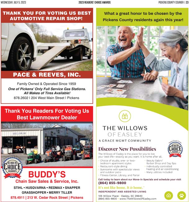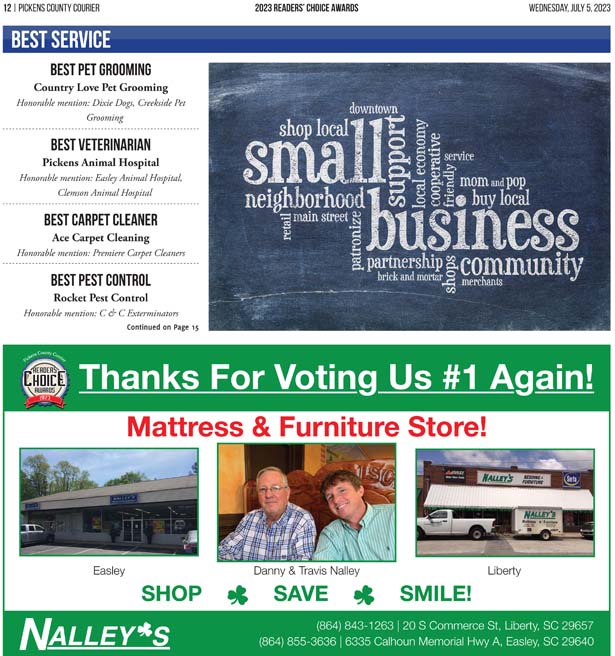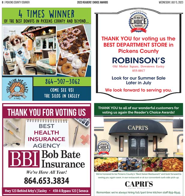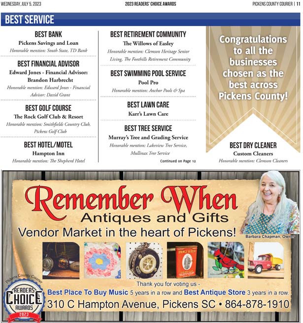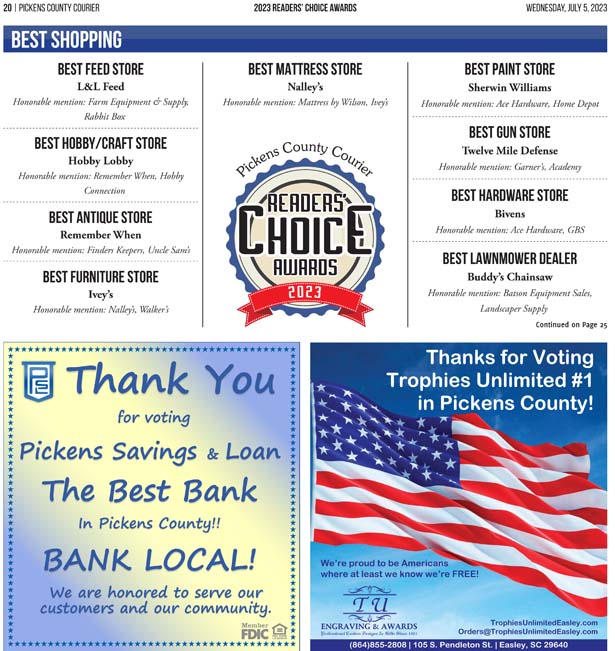 As a business locally owned and operated by Pickens County natives, the Courier knows just how amazing the people of our community are, and we cannot thank you enough for getting involved and letting your voice be heard in the annual Readers’ Choice Awards.