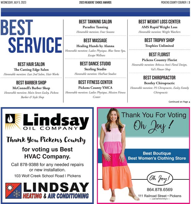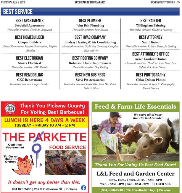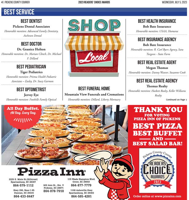 The businesses in this section are the best of what Pickens County has to offer. And these are not just our recommendations — they are YOUR choices. Over two weeks of balloting, thousands of Pickens County Courier readers took the time out of their days to vote for their favorite businesses. That customer loyalty is a testament to the quality of these local businesses and their dedication to serving Pickens County.