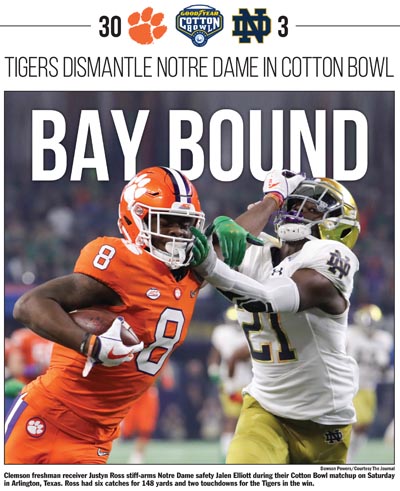 Keyed by highlight-reel plays from true freshmen Trevor Lawrence and Justyn Ross, along with a smothering defensive effort, the second-ranked Tigers steamrolled past No. 3 Notre Dame by a final score of 30-3 at AT&T