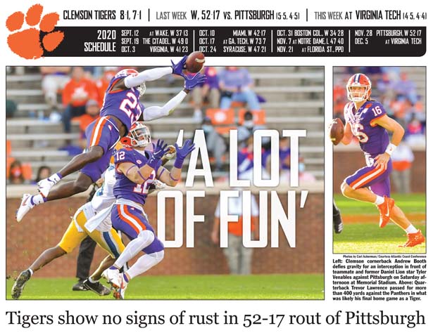 Outside of a shaky stretch at the start of the second half, the fourth-ranked Tigers (8-1, 7-1 ACC) didn’t miss a beat after two consecutive weekends without a game, beating Pittsburgh 52-17.