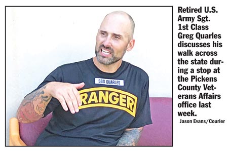 PICKENS — Retired U.S. Army Sgt. 1st Class Greg Quarles is walking across South Carolina to help raise awareness for the sports opportunities available to injured veterans.