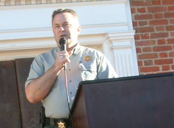 Pickens County sheriff Rick Clark speaks at a rally held in honor of domestic violence victims on the steps of the Pickens County Courthouse last week.